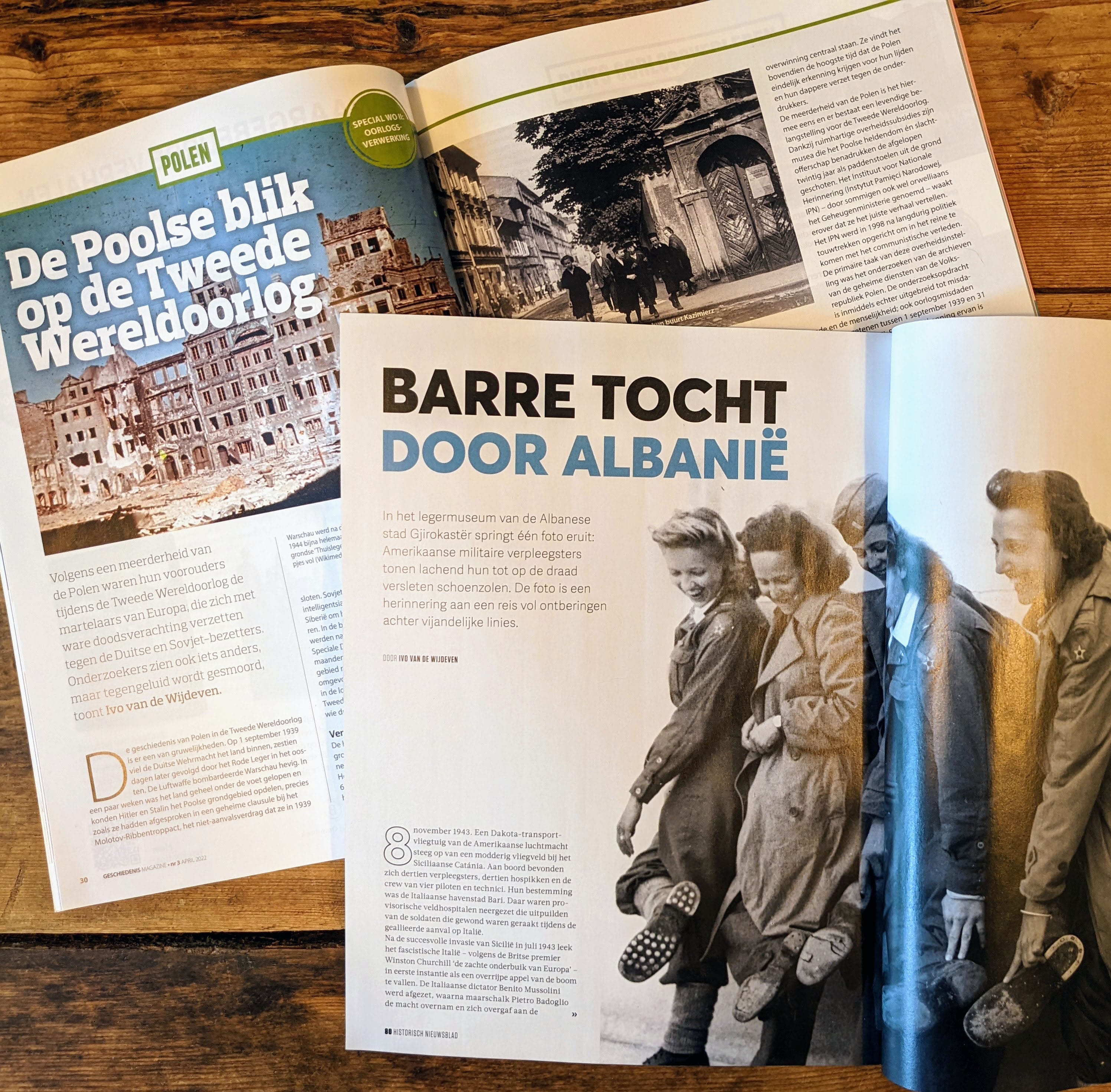 Meimaand WO2-maand 3 mei 202212 maart 2026 De maand mei is traditiegetrouw de maand waarin de twee beste geschiedenistijdschriften van Nederland met nummers en specials gewijd aan de Tweede Wereldoorlog komen. Ook ik heb dit jaar weer een bijdrage geleverd in de vorm van twee totaal uiteenlopende artikelen. Voor Historisch Nieuwsblad schreef ik over een bijzondere reddingsactie in bezet gebied. In 1943 stortten Amerikaanse verpleegsters neer achter vijandelijke linies in Albanië. Het artikel is gegroeid uit een bijzondere foto van opgeluchte verpleegsters met versleten schoenen die ik zag in het oorlogsmuseum in het kasteel van Gjirokastër en het geeft tevens een inkijkje in het ontstaan van de latere dictatuur van Enver Hoxha. In Geschiedenis Magazine staat een beschouwing van de wijze waarop de huidige Poolse regering de tragische geschiedenis van Polen tijdens de Tweede Wereldoorlog interpreteert én op opportunistische wijze inzet voor politiek gewin. In die zin is het een sneak preview van een van de hoofdstukken van mijn nieuwe boek De macht van het verleden, dat in oktober van dit jaar tijdens de Maand van de Geschiedenis zal verschijnen.